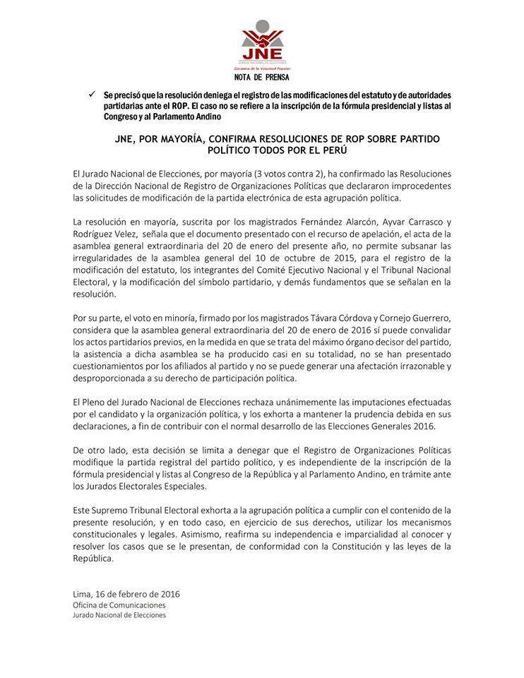 Por mayoría (3 votos contra 2), el pleno del JNE confirmó las resoluciones del ROP “que declararon improcedentes las solicitudes de modificación de la partida electrónica de Todos por el Perú” y no atendió a la apelación que presentó esa organización política.