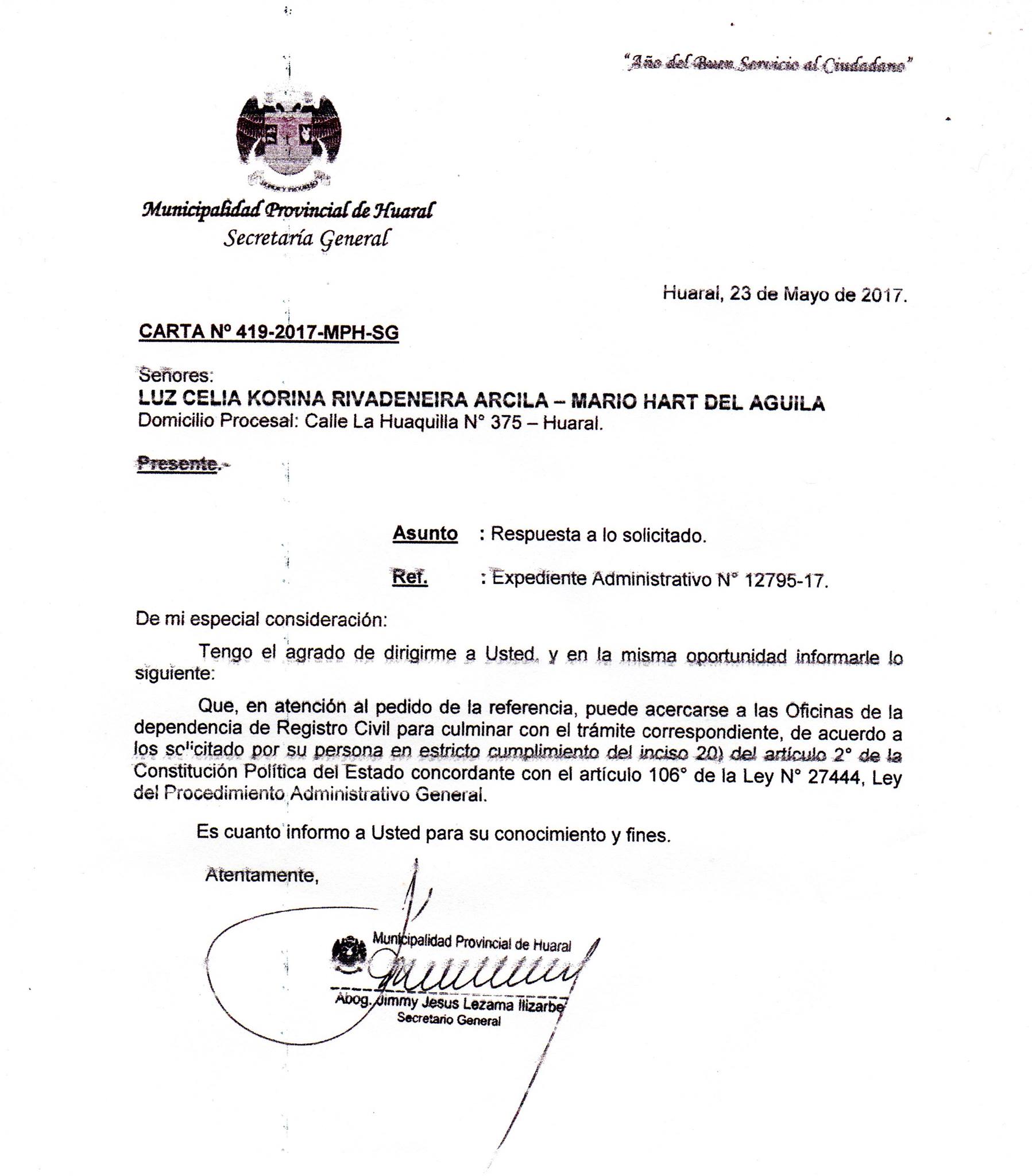 Según se desprende de la carta N°419-2017-MPH- de fecha 23 de mayo 2017, cursada por la municipalidad provincial de Huaral a Luz Celia Korina Rivadeneira Arcila y Mario Hart del Aguila, donde les indican a que se acerquen a la dependencia de Registro Civil para culminar con el trámite correspondiente, se estaría reconociendo implícitamente que el matrimonio realizado en la municipalidad huaralina ha sido considerado como válido, pero que, aún,deben de cumplir con completar la documentación exigida por las normas.
