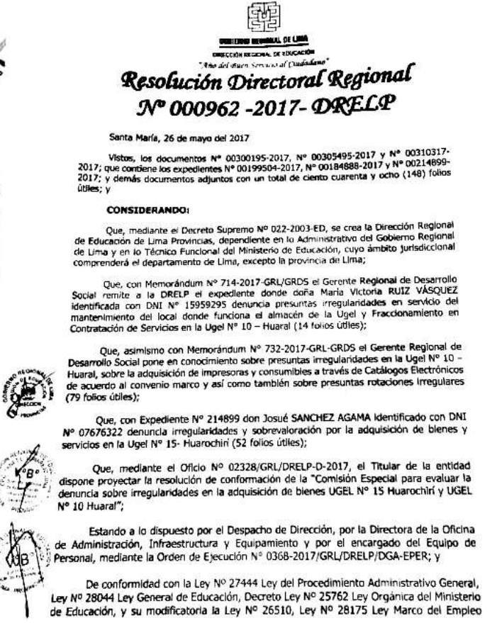 Mediante resolución directoral Nº 962, la Dirección Regional de Educación decidió designar la comisión investigadora para actos de corrupción en UGEL Nº 10 Huaral y UGEL Nº 15 de Huarochirí