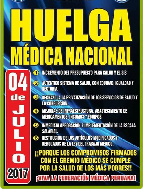 Ante la anunciada Huelga Médica indefinida hoy 04 de Julio, representantes del Cuerpo Médico del Hospital San Juan Bautista de Huaral, confirmaron su participación, dando a conocer a la población que se han adoptado las medidas necesarias para hacer frente a este paro.