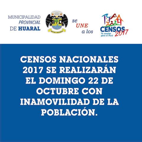 La Municipalidad Provincial de Huaral, apoyando el trabajo de difusión de los Censos Nacionales 2017, informa que el domingo 22 de octubre del presente año, es la fecha establecida para realizar el empadronamiento XII de Población, VII de Vivienda y III de Comunidades Indígenas, de acuerdo al Decreto Supremo N° 076-2017-PCM, publicado el día de 15 de julio en el Diario Oficial El Peruano, debiendo el Instituto Nacional de Estadística e Informática, prever la ejecución de todas las actividades censales, a fin que el empadronamiento nacional se ejecute en dicha fecha.
