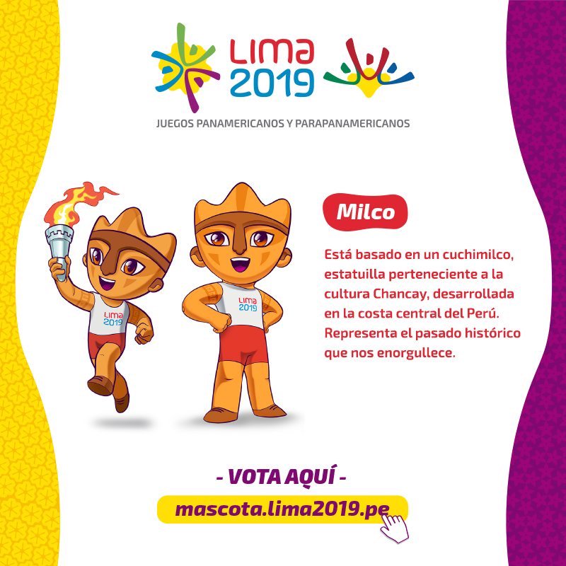 Una de las mascotas en competencia es ‘Milco’, diseñado por Andrea Medrano. Su mascota hace alusión al ‘Cuchimilco’, que es una estatuilla conocida por pertenecer a las culturas desarrolladas en el centro oeste de Perú, tanto en Lima, Chancay y Chincha.