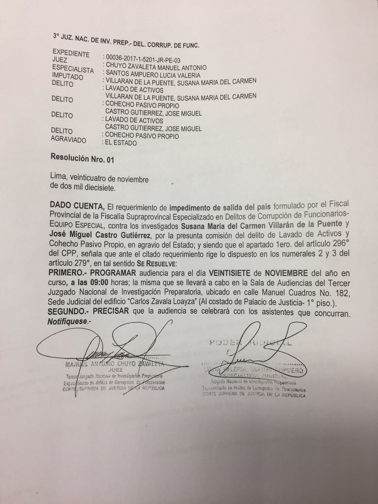 El Tercer Juzgado Nacional de Investigación Preparatoria del Sistema Especializado contra la Corrupción de Funcionarios programó para este lunes 27 la evaluación del pedido de impedimento de salida del país que la fiscalía solicitó contra la exalcaldesa Susana Villarán.
