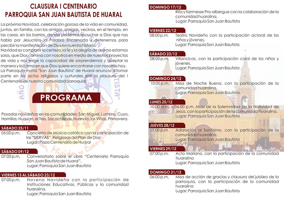 Como parte de las actividades de clausura por los 100 años de la iglesia matriz San Juan Bautista de Huaral, César Díaz- Profesor de Teatro, realizó la invitación a toda la comunidad huaralina, para que asistan al teatro navideño escenificado por niños y jóvenes.