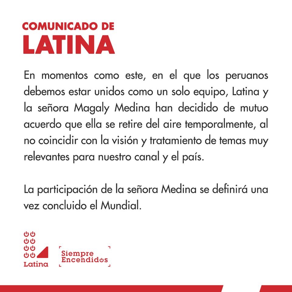 A través de un comunicado, la televisora señaló que «en momentos como este, en el que los peruanos debemos estar unidos como un solo equipo, Latina y la señora Magaly Medina han decidido, de mutuo acuerdo, que ella se retire del aire temporalmente, al no coincidir con la visión y tratamiento de temas muy relevantes para nuestro canal y el país. La participación de la señora Medina se definirá una vez concluido el Mundial».