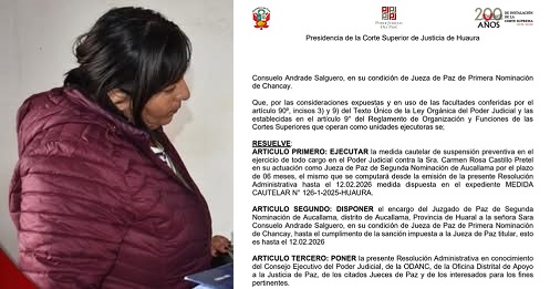 La magistrada es investigada por presuntamente otorgar constancias de posesión pese a estar impedida de realizar dicho trámite. La medida cautelar fue oficializada mediante la Resolución Administrativa del expediente Medida Cautelar N.° 126-1-2025-Huaura, la cual establece que la sanción regirá hasta el 12 de febrero de 2026.
