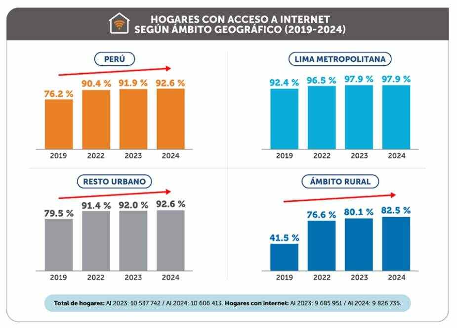 La cifra representa un crecimiento de más de 16 puntos porcentuales frente al 2019 (76.2%) y confirma la tendencia ascendente en la conectividad nacional. En total, 9.8 millones de hogares peruanos estaban conectados a internet al finalizar el año anterior.